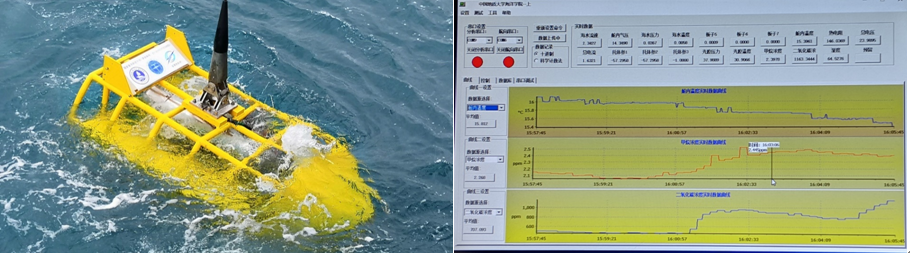 “近海底原位多参量地球化学测量装置”参加联合海试(左:仪器入水;右:实时数据显示及气体浓度异常)