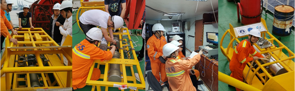 (从左至右依次为:课题负责人吕万军老师现场指导;拖体组装及水上供电通讯测试;甲板控制室仪器控制及数据记录;仪器出水后的清洗和维护)