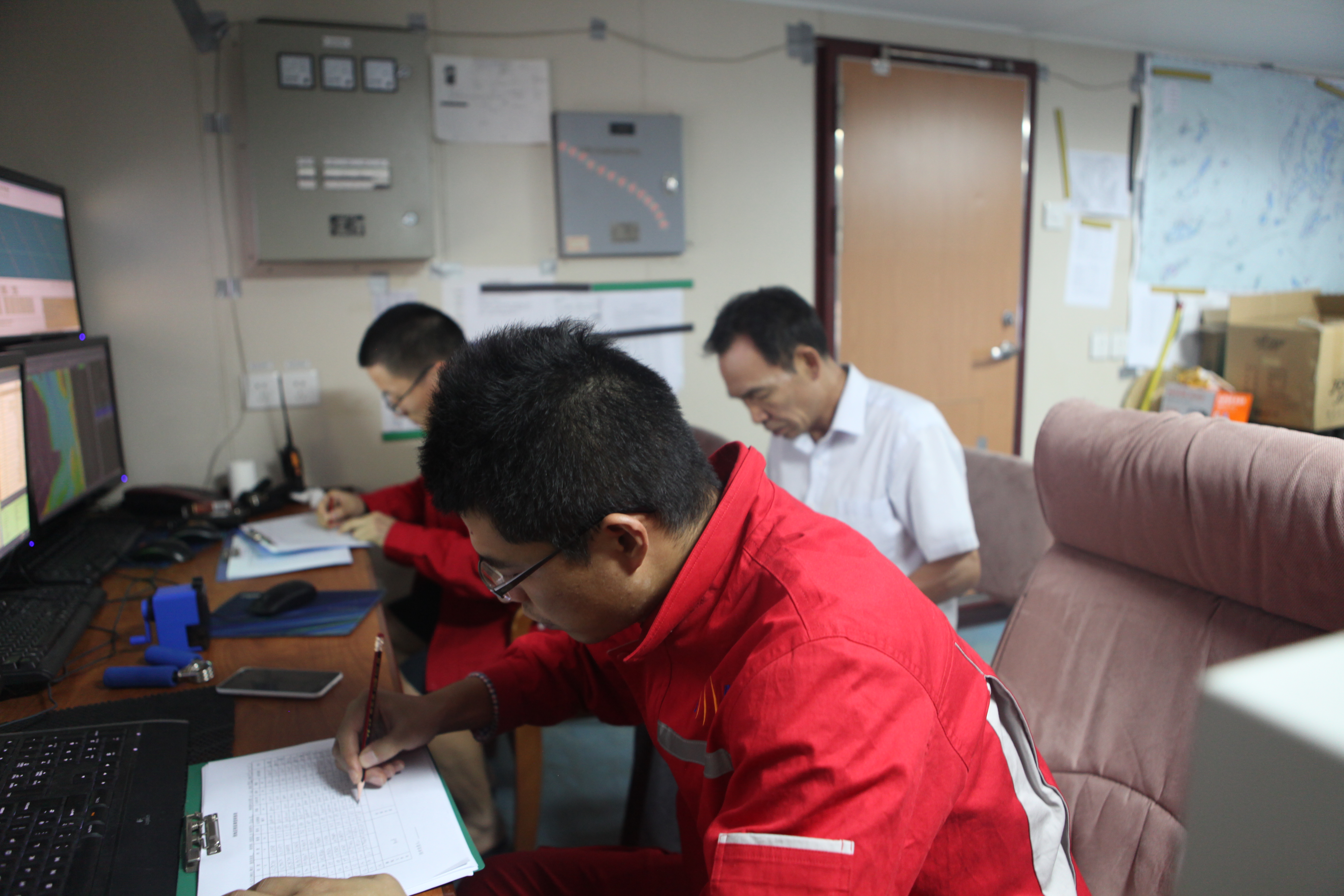 由于我们的任务时间比较紧张,所以我们船是24小时在不停的工作,我每天是晚上九点到凌晨两点值班,这使得我改变自己在学校的作息时间。第一天还真是不太适应,值班时就有点打瞌睡,后来经过慢慢的调整,我也适应了这种工作。值班的时候主要观察仪器是否有故障,另外我们每半小时需要记录一组原始数据,因此工作还是很轻松的。