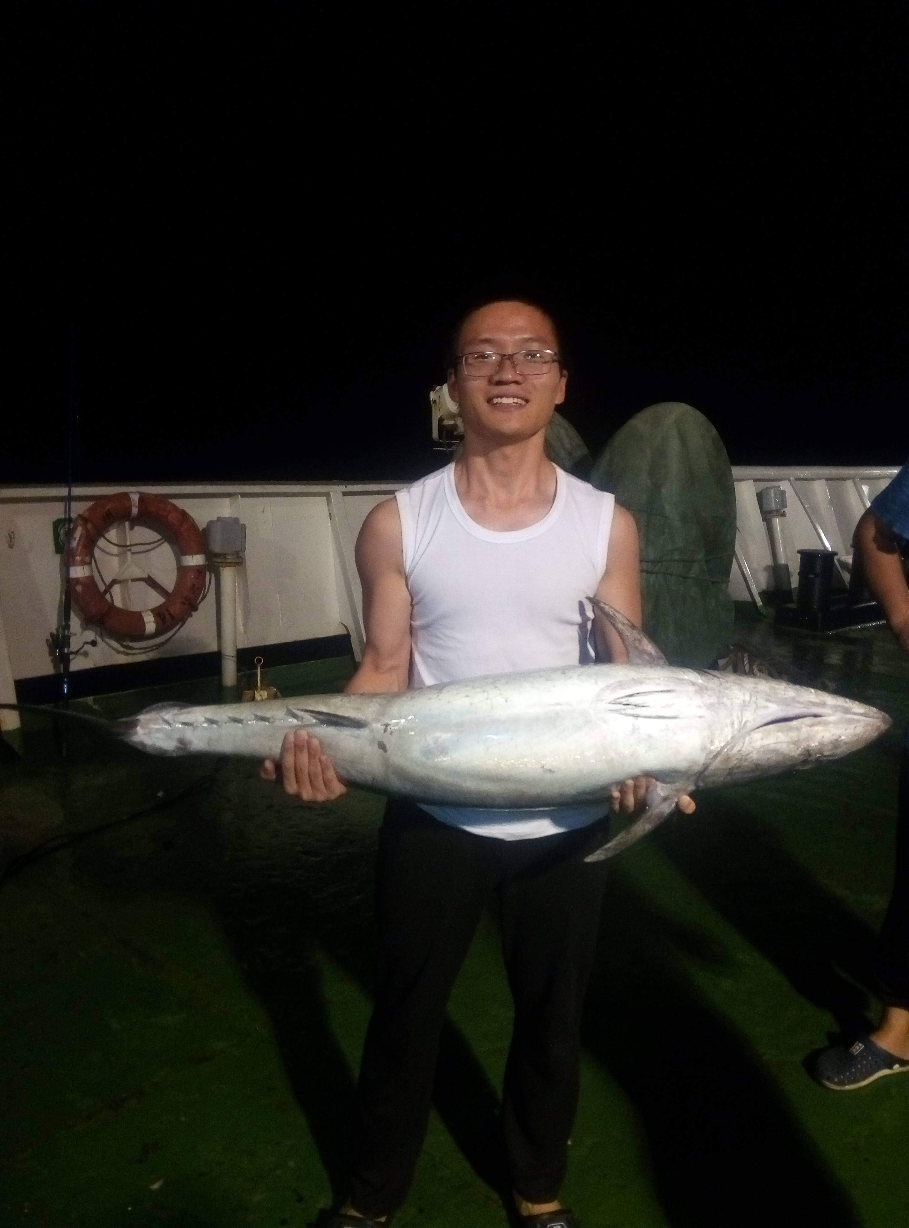 经过了60多天的工作,我们的测量任务也基本完成了,想着马上就可以回到陆地了,心中有些小期许,更多的是对陆地生活的怀念。我们的一个调查队员说,你出过海之后就会更加珍惜陆地上的生活,且行且珍惜,现在想想还真是这样。在上岸的前两天我们停船修整一晚,这时,大家便拿出渔具准备钓鱼,我们船的下方是珊瑚礁,珊瑚鱼比较多,我这样的菜鸟都能钓到一些。有一个船员钓了一条50斤左右的金枪鱼,体型还是很大的,一个人抱起来都很吃力。