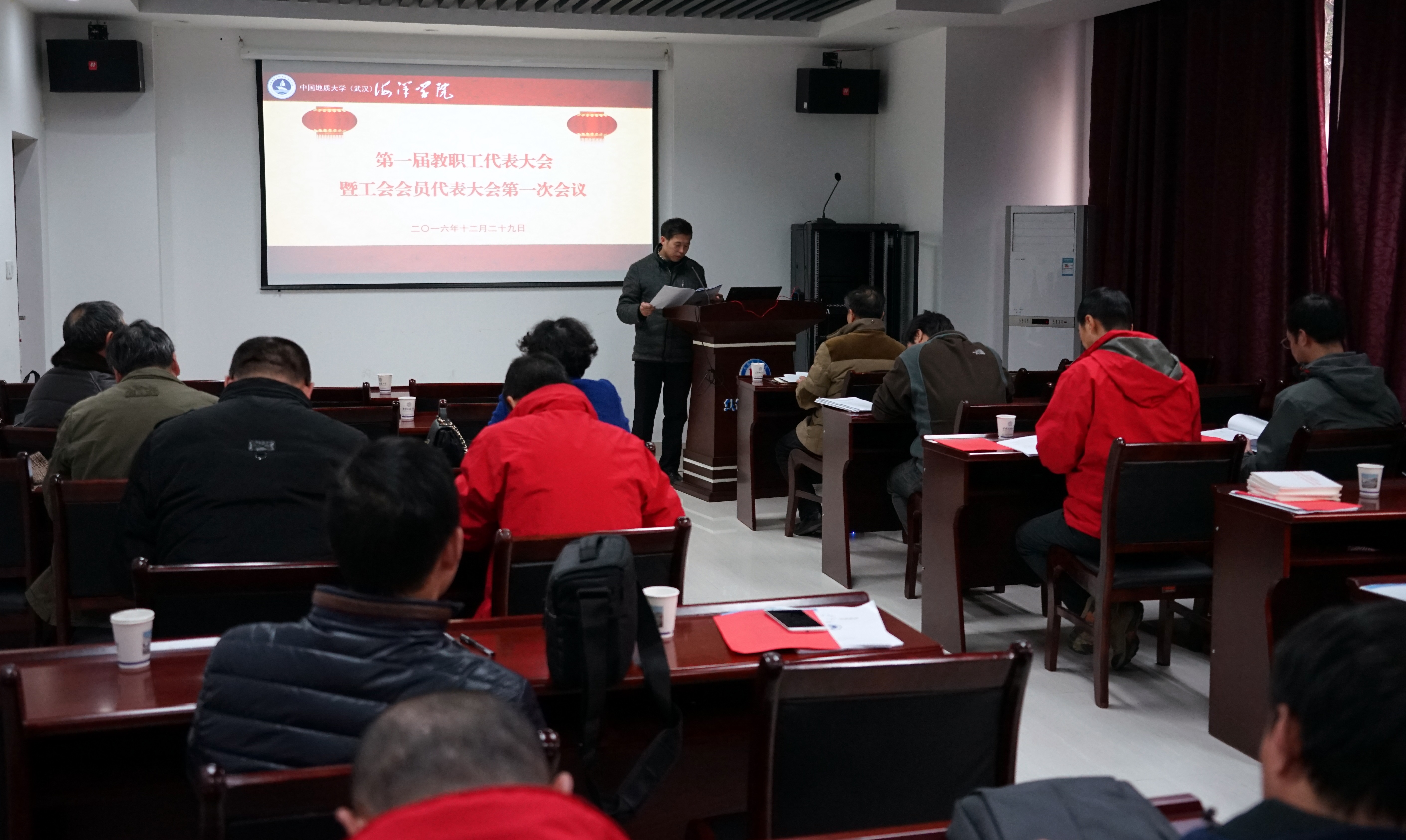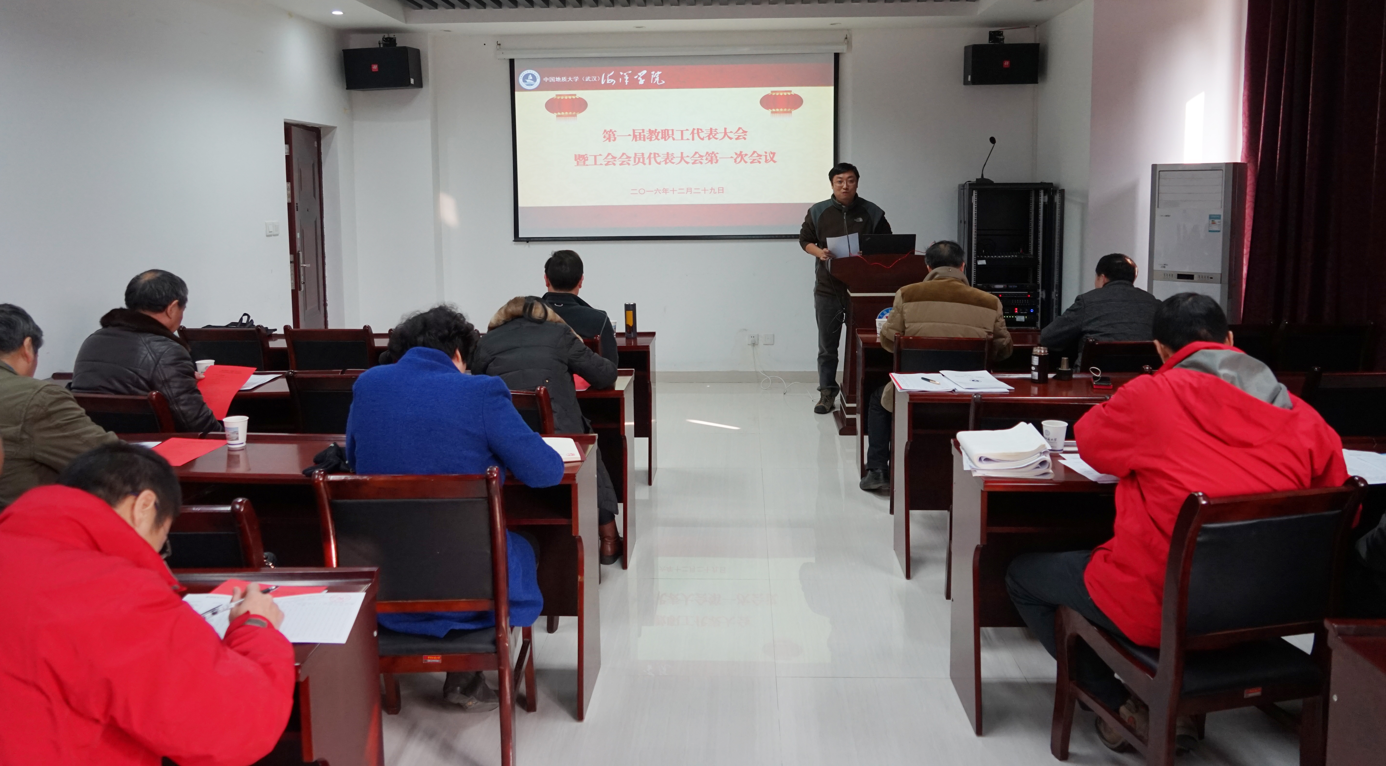 2016年12月29日,中国地质大学(武汉)海洋学院第一届教职工大会第一次会议暨第一届工会会员大会第一次会议在校丝绸之路学院105室隆重开幕,会议由院党委书记解习农同志主持,副校长万祥清同志,工会副主席杨茜同志到会祝贺并致贺词。