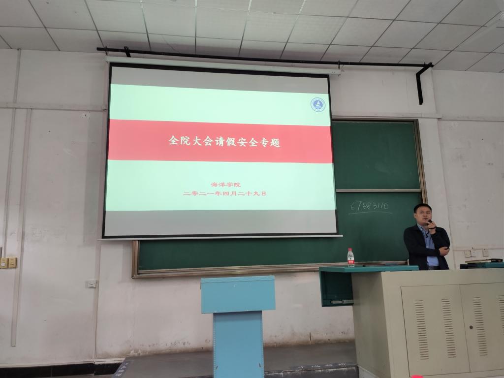 辅导员陈杨就学院五一假前安全稳定工作做了工作部署。会上强调了五一假期期间全院同学做到“非必要,不外出”,坚持疫情常态化管理,各班坚持“日报告,零报告”制度,做好体温监控。陈杨为学院全体同学梳理了学院请销假管理办法,就请假类型、请假手续和不予请假的类型为同学们做了详细说明,并要求全院同学今后务必严格落实请销假制度。