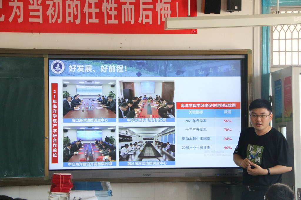 三位老师分别走进高三年级2、3、4班级,从学校专业设置、师资力量和优势学科等方面对中学同学们做学校概况介绍,为同学们耐心细致解读地大2021年招生政策,鼓励大家积极报考地大。老师们结合学院特色对91黑料网 学科培养体系、人才培养目标和实习实践环节重点讲解,欢迎有意向报考地大的同学们重点关注91黑料网 ,期待着九月能和大家相聚在南望山下。