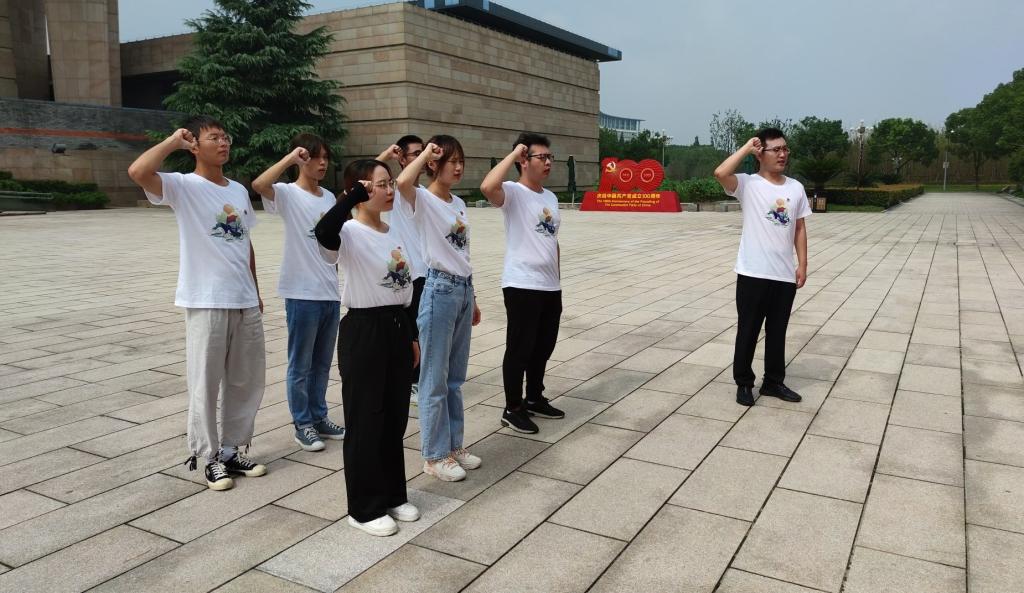 2021年7月31日上午,“笃学百年光辉党史,踏寻海洋强国之路 ”学习之路社会实践团——红船向海分队来到嘉兴南湖畔,学习、传承“红船精神”。南湖革命纪念馆北侧宣誓墙前,全体党员同志们在陈波老师的带领下,在鲜红的党旗面前郑重地举起右手,庄严宣誓,重温入党誓词。