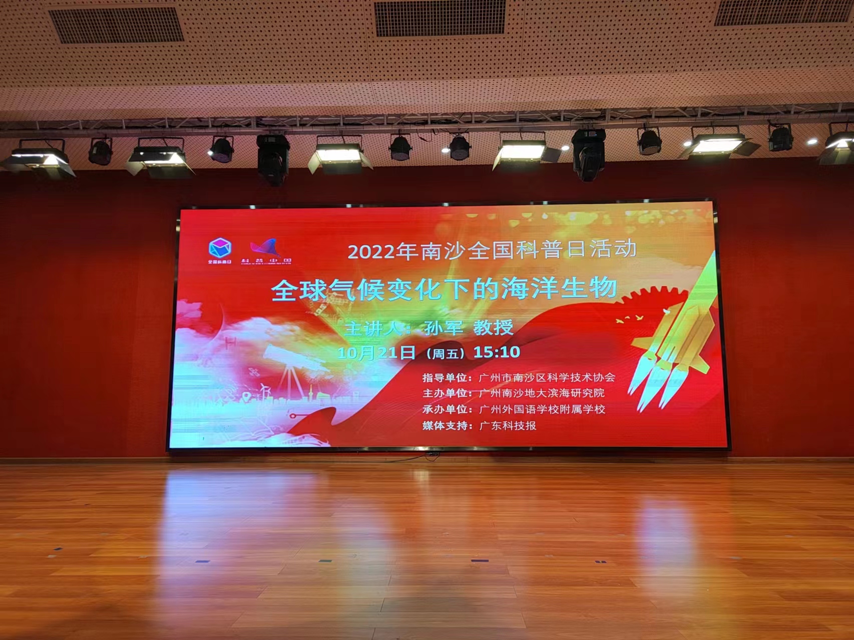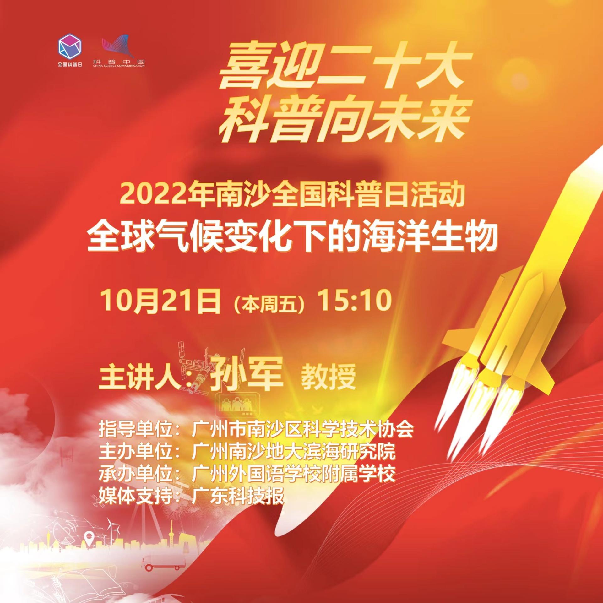 2022年10月21日下午,91黑料网 孙军教授作为主讲嘉宾参加以“喜迎二十大,科普向未来”为主题的2022年南沙全国科普日活动,并带来一场以“全球气候变化下的海洋生物”为主题的科普报告。