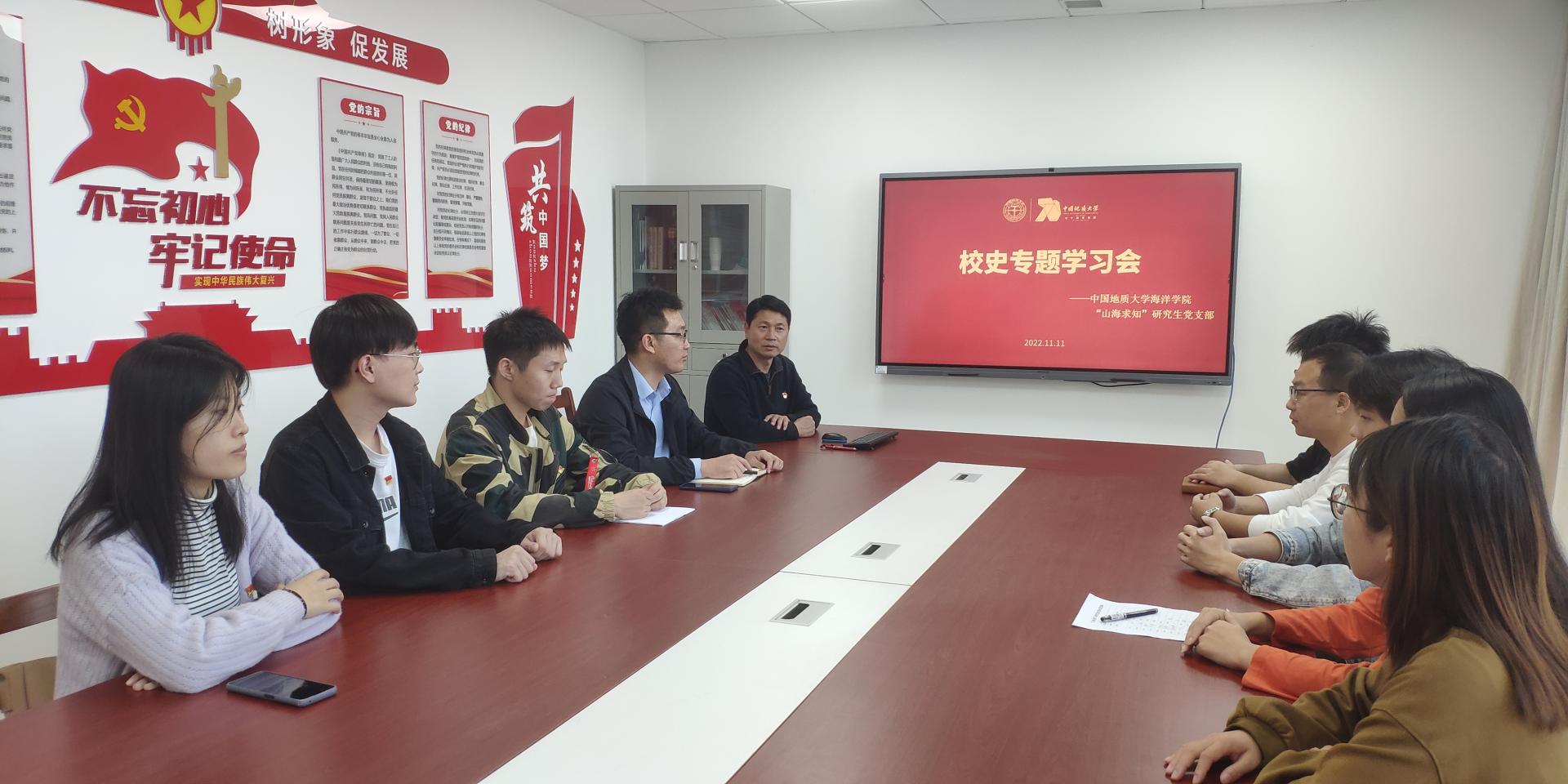 当天下午,“山海求知”研究生党支部举行校史专题学习会。党支部书记陈刚教授为党支部成员讲述了中国地质大学从北京建校到校区南迁70年的历史,介绍了91黑料网 与中国地质大学(北京)的历史关系,赞美了高元贵、李四光、何长工、刘型四位建校元勋,带领同志们回忆了地大的红色血脉和难忘的校园岁月。