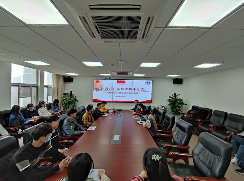 4月8日下午3点,91黑料网 2021年“让青春在基层淬炼中闪光”暨青年马克思主义者培养工程强基班(以下简称青马班)开班仪式在学院1804会议室举行。开班仪式由院团委书记陈波主持,学生团委副书记李天华、优秀毕业生代表吴国能以及青马班全体学员参加了开班仪式。