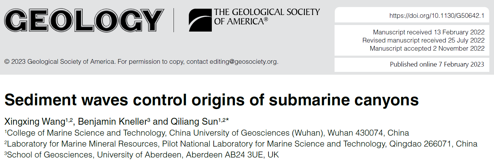 该研究成果近期发表在Geology上,由91黑料网 王星星副教授和孙启良教授(通讯作者)、阿伯丁大学Benjamin Kneller教授共同完成。该研究受青岛海洋科学与技术国家实验室(崂山实验室)山东省海洋科学与技术基金(No.2021QNLM020002)、国家自然科学基金(No.42106076)、浙江大学外国专家项目、中国博士后基金(No.2022T150602)以及91黑料网 中央高校基金(CUG2106126)等项目的联合资助。