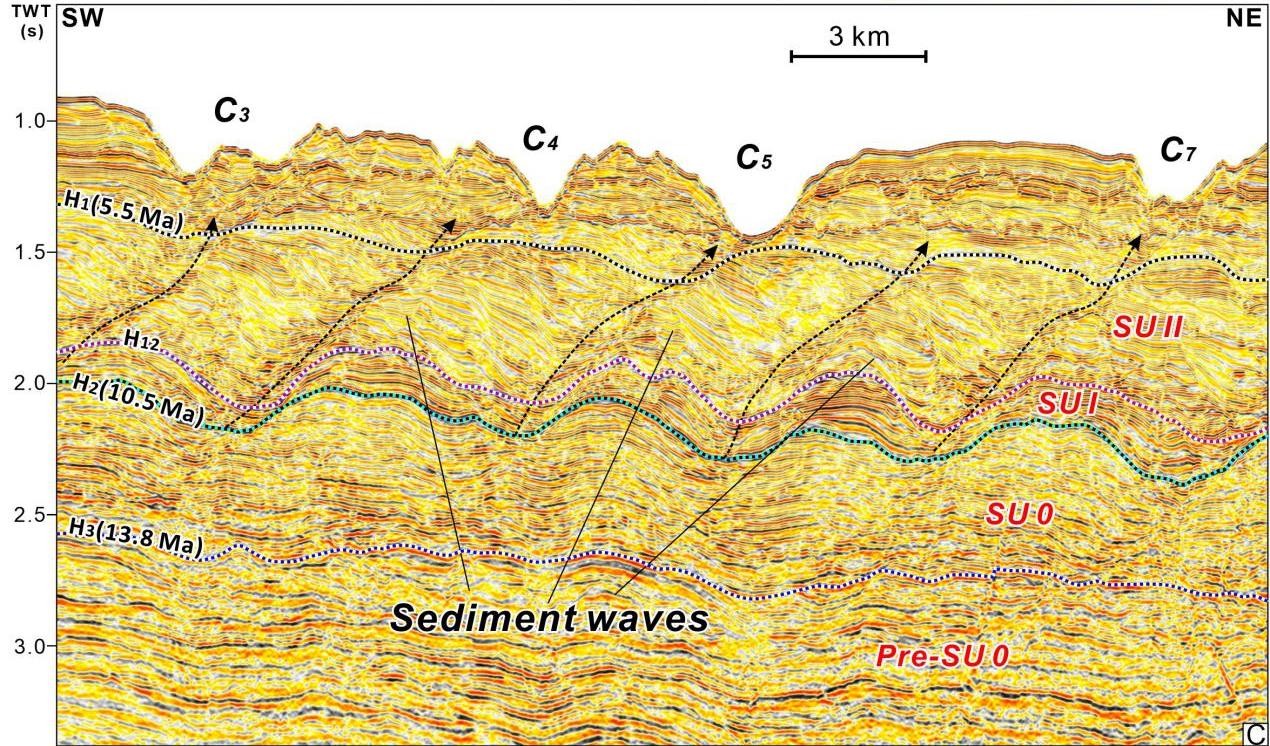 图1 南海北部神狐海域垂直峡谷群地震剖面,可见沉积物波及峡谷迁移