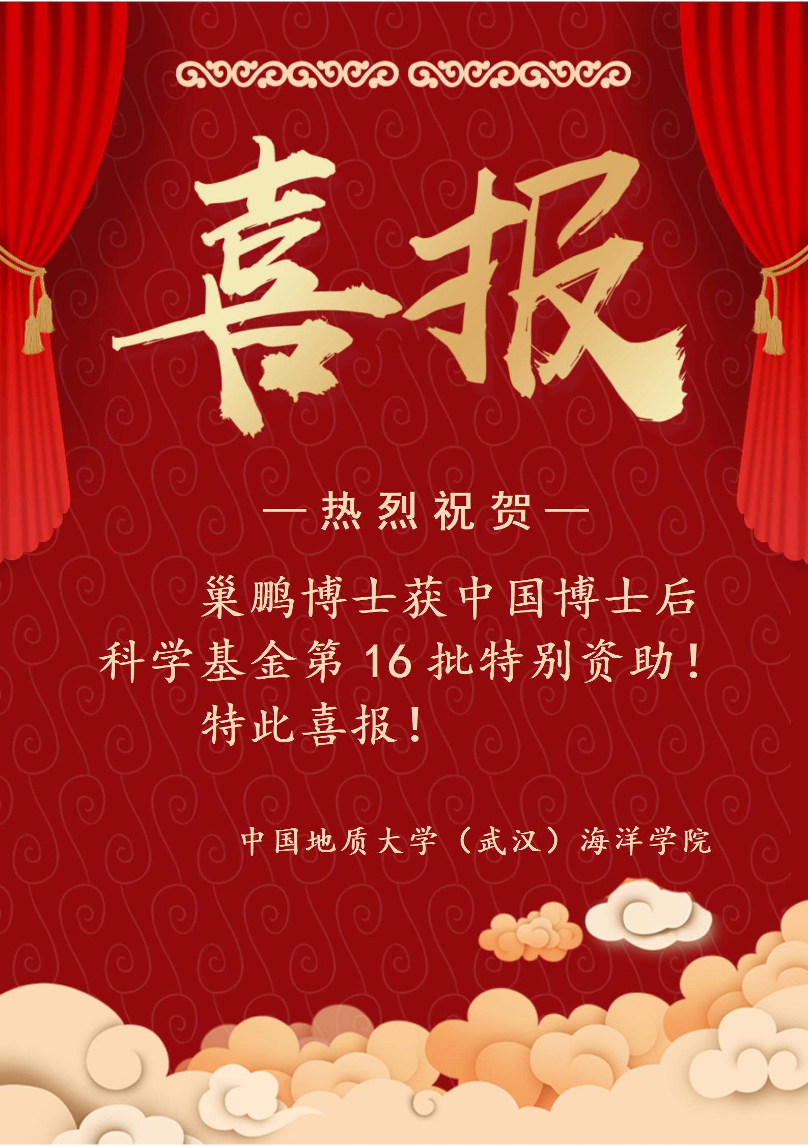 喜报!91黑料网 巢鹏博士获中国博士后科学基金第16批特别资助