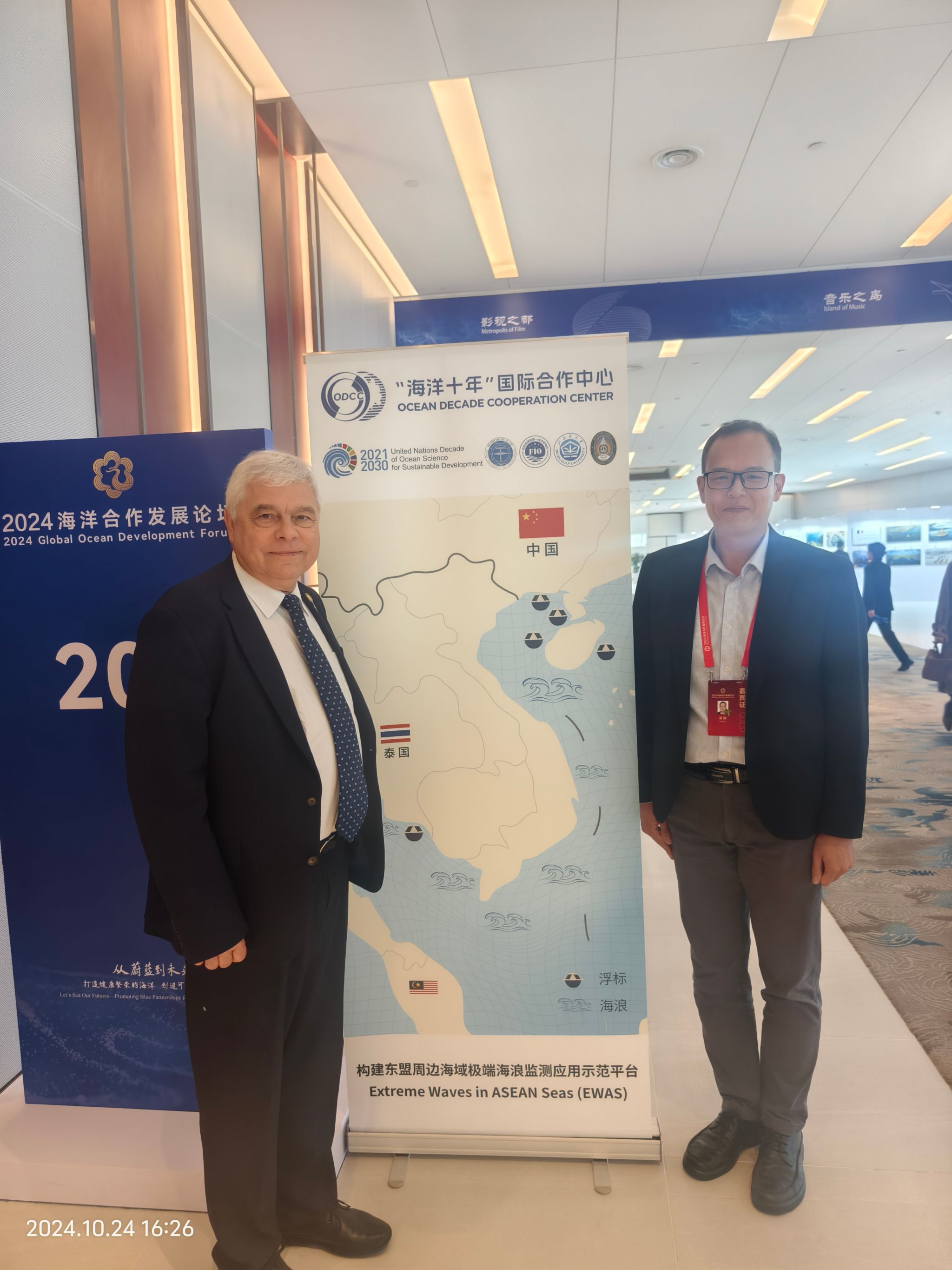 图.联合国教科文组织政府间海洋学委员会秘书处前执行秘书弗拉基米尔·拉宾宁先生(Mr.Vladimir Ryabinin)与宫勋教授在项目海报前合影
