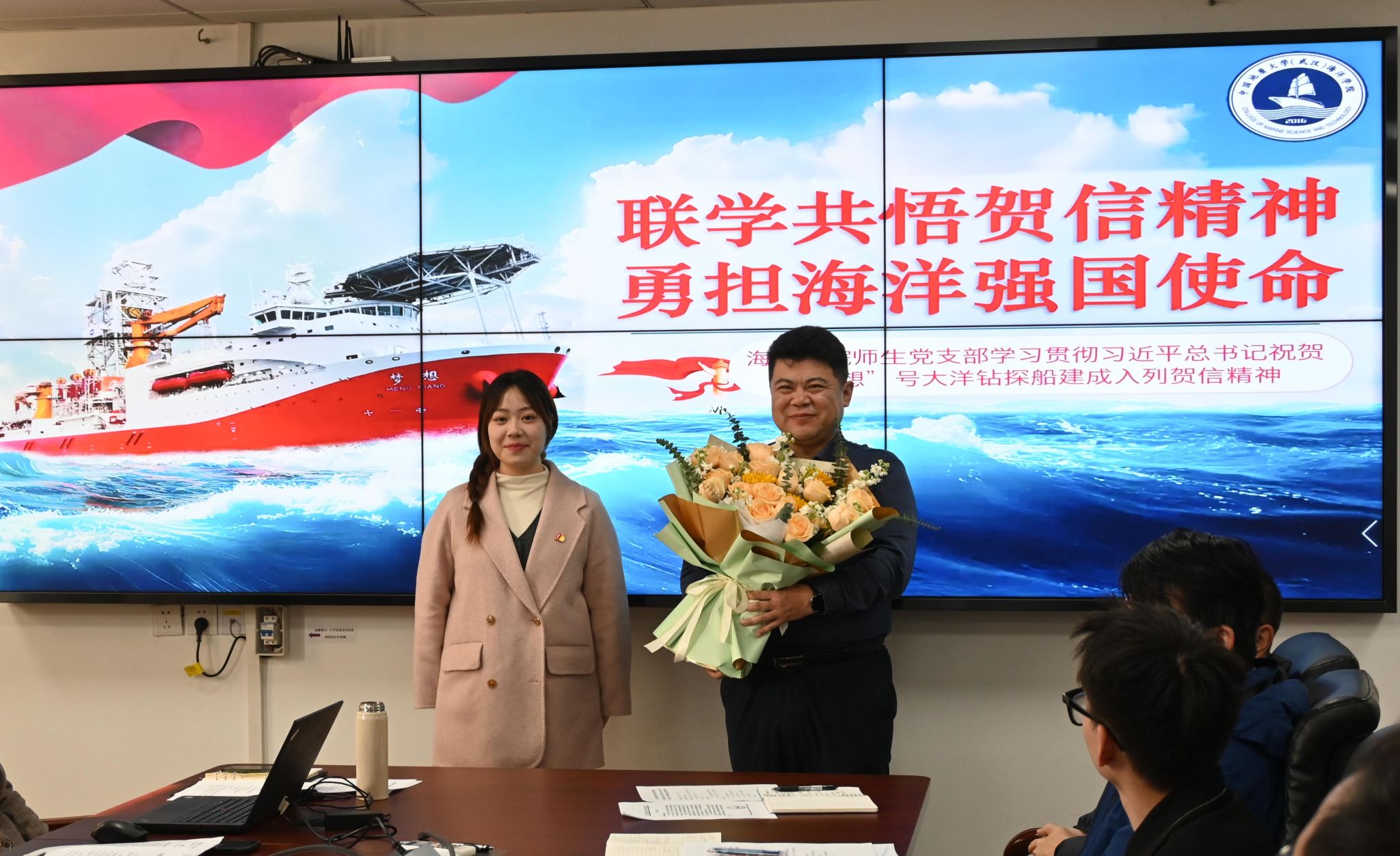会议伊始,党委副书记钟苹宣读了习近平总书记致“梦想”号大洋钻探船建成入列的贺信,并带领与会人员共同观看新闻联播中“梦想号”入列专题新闻,深入领会习总书记贺信精神。