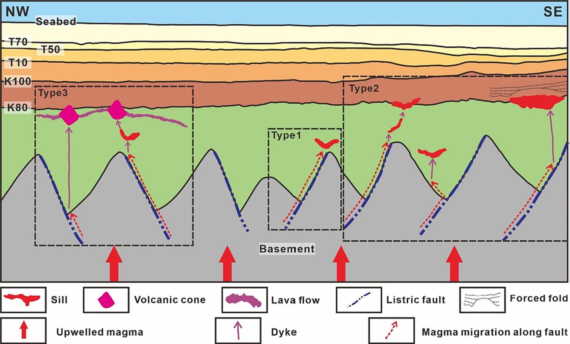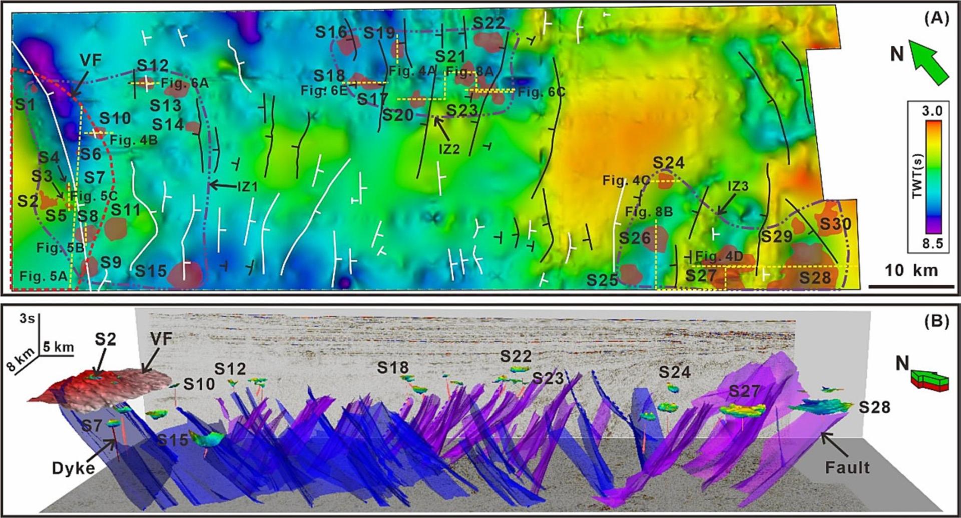 大南盆地位于新西兰南岛东南近海,是在白垩纪冈瓦纳大陆破裂时期形成的裂谷盆地。本研究利用三维反射地震资料,在大南盆地北部识别出大量岩浆体和断层。这些岩浆构造形成于75-58 Ma,处于裂谷活动结束之后的时期,区内断层主要为NE-SW走向。此外,在火山区中识别出4期热液喷口,其中3期在垂向上连续发育,并在其上部发育古麻坑,在麻坑内及其周围识别到大量的流体存在。