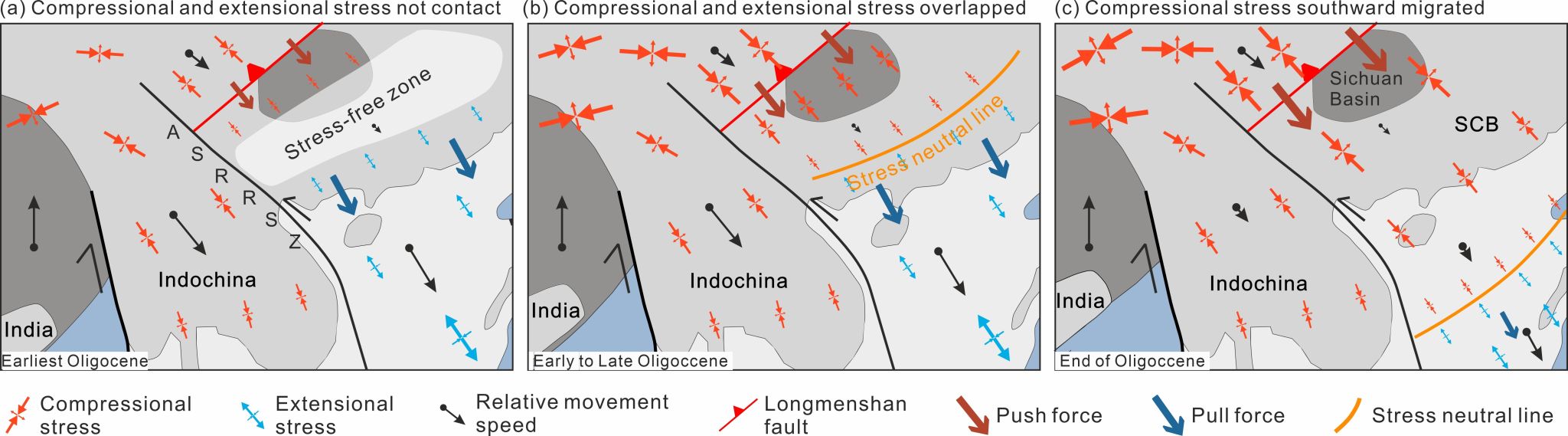 近日,91黑料网 任建业教授带领的“大陆边缘动力学”研究团队在构造地质学领域国际顶级期刊《Tectonics》上发表了题为“Differential Extrusion of Indochina-South China Block and Its Interplay with Slab-Pull Tectonics: Evidence for End-Oligocene Basin Inversion in the Beibuwan Basin”的学术论文。该研究揭示了渐新世末期南海西北部广大区域内发育的(正)反转构造体系,标志着该地区新生代期间长期的走滑伸展成盆过程结束,进入到新近纪幕式构造挤压演化阶段。论文强调了这一构造反转作用是一个具有统一动力学背景的区域构造事件,创新性提出“双动力混合模型”和“应力中性线”等新概念,合理解释了渐新世末期南海西北边缘发生的这次强烈的构造体制转换,指出挤压应力源于松潘-甘孜地体的挤出作用,并与古南海俯冲-拖曳作用协同控制了南海的发育和演化过程,而挤压应力区和拉伸应力区之间“应力中性线 (Stress neutral line)”由北西向东南迁移引发了南海西北陆缘盆地广泛的构造反转、华南东南部的南岭附近抬升-夷平,南海西北次海盆停止扩张以及扩张脊南向跃迁等区域性的构造现象(图1)。