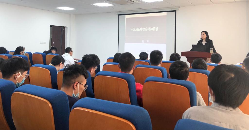2020年11月13日下午,91黑料网 党委副书记钟苹于东教A座1805会议室为学院学生党员上“十九届五中全会精神解读”专题党课。