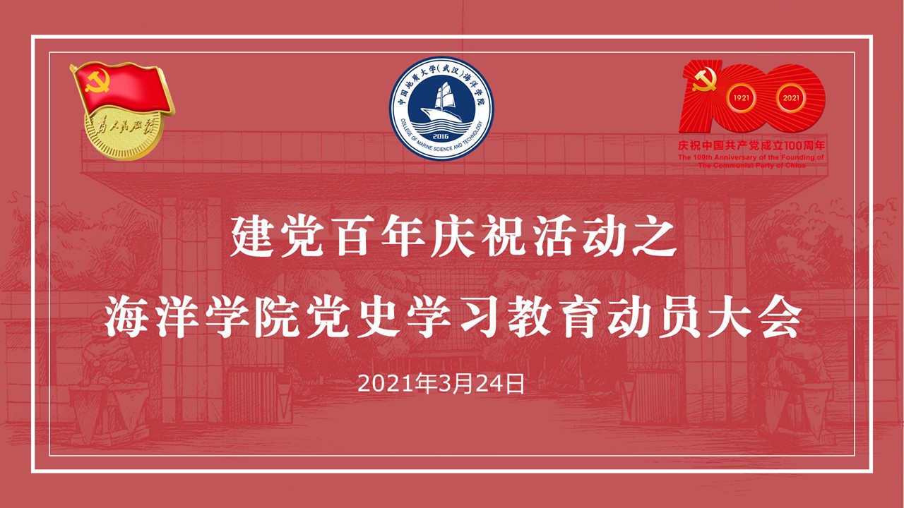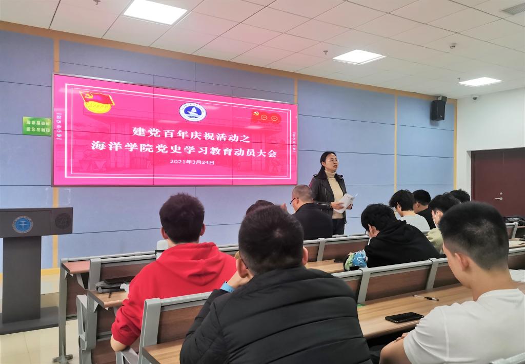 学院党委书记成军以“不忘初心,牢记使命——学习中国共产党百年辉煌史”为题为学院全体学生党员、入党积极分子上党史学习教育第一课。成军结合“为什么学习中共党史”、“中共党史的基本脉络”两方面,带领同学们一同重温习总书记关于学习共产党历史的重要论述,回顾中国共产党团结带领中国人民不懈奋斗的光辉历程。他激励大家在党史学习中要自觉做到学史明理、学史增信、学史崇德、学史力行,同时要把党史学习教育的成效转化为专业学习的强大动力,瞄准国家海洋强国战略的发展需求,以优异的专业素养献礼建党100周年。